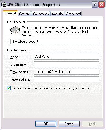 In the Account Properties dialog, verify your settings for the account are formatted the same. Make proper adjustments for your actual name, e-mail, and domain name: